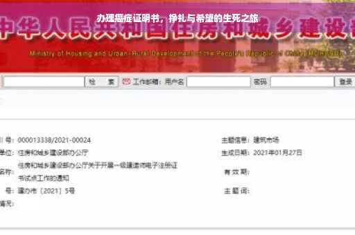 摘要:办理癌症证明书是一场生死之间的挣扎与希望的旅程。患者需准备相关医疗证明文件,经历诊断、治疗和评估等阶段后,方可获得这份重要的证明书。办理过程中,患者需了解所需材料、流程与注意事项,以便顺利获得证明,为后续治疗或相关手续提供重要依据。希望之光在艰难挣扎中闪烁,患者需坚定信念,勇敢面对挑战。