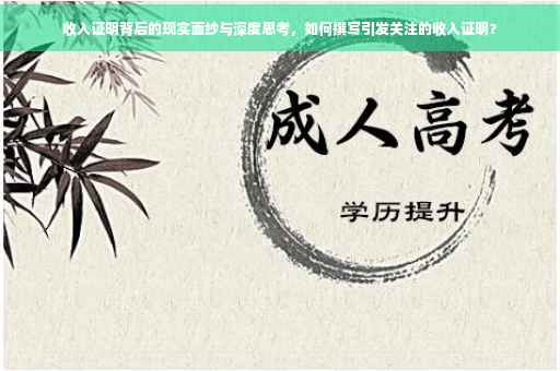 随着社会的进步和经济的发展,越来越多的人开始关注收入证明这个话题,收入证明在我们的日常生活中扮演着重要的角色,无论是求职、贷款还是社交场合,都需要出示收入证明来证明自己的经济实力,这个看似简单的证明背后却隐藏着许多不为人知的秘密和故事,本文将围绕收入证明展开讨论,揭开现实的神秘面纱,引发深度思考。