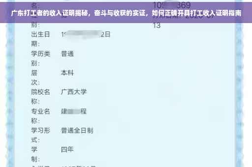 摘要:广东打工者的收入证明是对其辛勤劳动成果的实证,反映了他们的奋斗与收获。开具收入证明通常需要提供工作证明、工资流水等相关材料。这一过程简单便捷,打工者可以通过向所在单位财务部门或人力资源部门申请,经过核实后获得收入证明。这不仅是对个人劳动价值的认可,也为他们在社会中的权益保障提供支持。