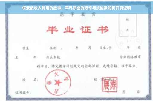 摘要:保安低收入证明揭示了这一平凡职业背后的艰辛与挑战。保安工作虽看似简单,但实际上需要承担巨大的责任和压力。开具保安低收入证明的过程也较为复杂,需要相关证明文件和流程。本文旨在探讨保安行业的收入现状、面临的挑战以及如何应对,帮助更多人了解这一职业的不易。