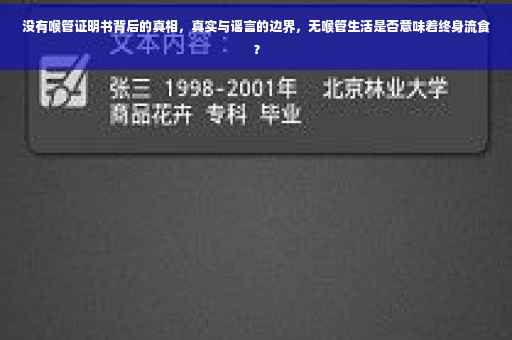 摘要:没有喉管证明书”的话题,引发了人们对于真实与谣言边界的探讨。网络上的种种传闻和疑问,例如没有喉管是否意味着一辈子只能吃流食,需要我们去伪存真,探寻事实真相。在信息时代,面对纷繁复杂的传闻,我们应保持理性思考,不盲目相信未经证实的言论,共同维护健康的网络生态。