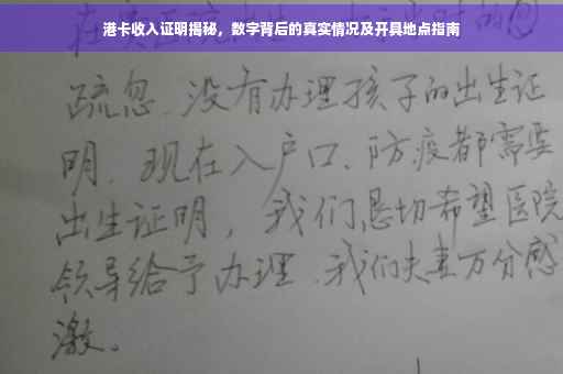 摘要:港卡收入证明是一份重要的文件,能够揭示数字背后的真实情况。对于需要开具港卡收入证明的个人或企业,应前往相关银行或雇主单位开具。该文件具有证明个人或企业收入情况的作用,能够帮助个人申请贷款、信用卡等金融服务,同时也为企业招聘、评估员工提供重要参考。在获取港卡收入证明时,需要注意证明的真实性和合法性,确保信息的准确性。