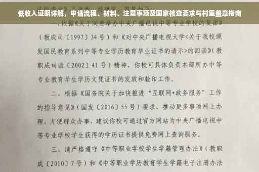 摘要:低收入证明是用于证明个人或家庭经济状况的一种证明,申请时需遵循一定流程和注意事项。申请人需准备相关材料,如身份证、收入证明等,并前往村委会或乡镇政府进行申请,证明中需村里盖章。国家会对这些证明进行核查,以确保证明的真实性和有效性。在申请过程中,申请人需留意提交材料的完整性和准确性,以确保顺利获得低收入证明。