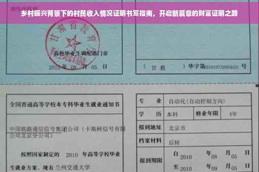 摘要:,,在乡村振兴的背景下,村民收入情况证明成为展示农村发展新成果的重要一环。证明内容应简洁明了,包含村民基本信息、收入来源及收入水平等关键信息。撰写时需注意客观真实,避免夸大或虚构。这不仅是对村民收入情况的证明,更是对乡村振兴成果的肯定和展示。通过规范的证明格式和内容,展现乡村振兴下的新篇章,激发更多村民参与乡村发展的热情。