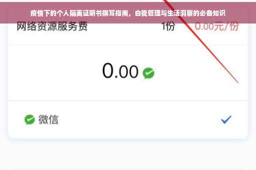个人隔离是防控疫情的有效措施之一,在个人隔离期间,我们不仅要遵守隔离规定,还要注重自我提升和生活洞察,通过个人隔离证明书,我们可以证明自己的健康状况和行程轨迹,为复工复学提供重要依据,我们也要积极传播正能量,为抗击疫情贡献自己的力量。