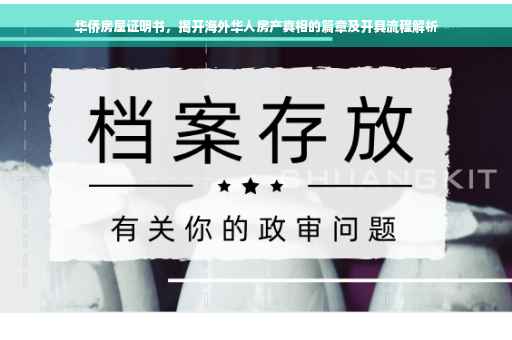 摘要:,,本篇文章是关于华侨房屋证明书的介绍和解析,旨在探寻海外华人房产真相。文章将详细介绍如何开具华侨房屋证明书,包括所需的材料、流程、注意事项等。通过本文,读者可以更好地了解华侨房屋证明书的开具过程,以便顺利办理相关房产事务。