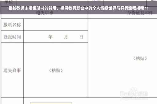 摘要:本文探讨了教师未婚证明书的相关内容,介绍了如何开具教师未婚证明书,并探寻了教育背后的个人情感世界。文章指出,教师未婚证明书是一份证明教师未婚状态的官方文件,其开具过程需要前往户籍所在地或所在地的民政部门,并提交相关证件材料。文章同时指出,教育不仅仅是传授知识,也涉及到教师的个人情感世界,未婚教师的情感状态也是其个人成长的一部分。