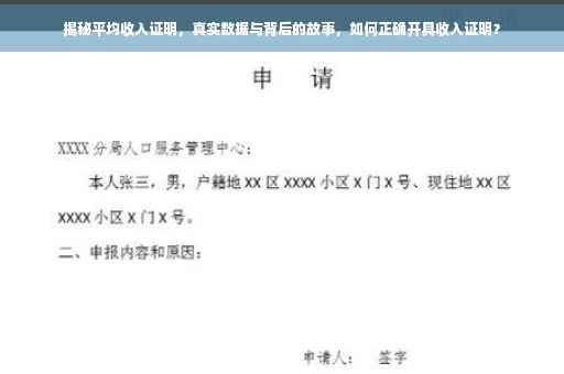 摘要:本文将介绍如何开具平均收入证明,同时揭示真实的数据与背后的故事。通过深入了解收入证明的重要性及其背后的因素,我们将探讨如何获取准确的平均收入数据,并了解这些数据背后的社会经济背景和影响。本文将帮助您了解这一过程,确保您能够顺利开具收入证明并理解其含义。