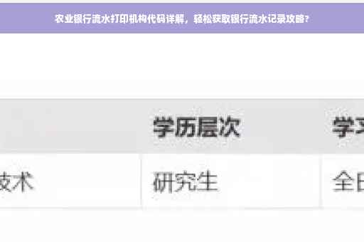 关于农业银行流水打印机构代码及相关政策,可能因地区和时间而异,为确保获取最准确的信息,请拨打农业银行客服电话或前往当地农业银行柜台咨询,客服人员会为您提供详细的解答和指导。