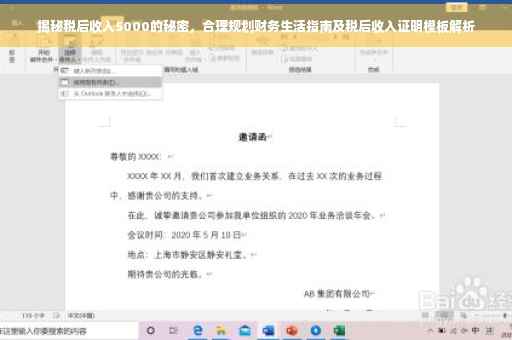 摘要:税后收入达到5000元,如何合理规划财务生活?关键在于制定明智的财务规划。通过有效的预算管理和理财策略,确保收支平衡并实现财务目标。了解税务政策,优化收入结构,节约开支,积极储蓄和投资,是提升税后收入的关键。合理规划财务生活,享受舒适、自由的生活。附税后收入证明模板,助你更好地管理个人财务。