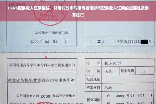 摘要:CFPS配偶收入证明是证明配偶经济能力的重要文件,背后涉及诸多故事与影响。本文将探讨如何撰写配偶收入证明,包括其重要性、所需信息以及注意事项。通过了解这些内容,帮助读者更好地理解和处理与配偶收入证明相关的事务。