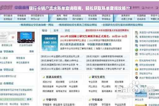 摘要:查询银行卡销户流水账单攻略:为方便用户查询银行卡销户流水账单,可按照以下步骤操作。登录银行官网或相关APP,进入个人账户。选择交易明细或流水账单选项,并选定查询时间范围。查看并打印流水账单。如遇到问题,可联系银行客服协助解决。此攻略简单易懂,帮助您轻松查询银行卡销户流水账单。??