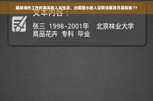 摘要:本文将介绍如何获取出国薪水收入证明,揭示海外工作的真实收入与生活状况。文章将简要说明出国薪水收入证明的重要性,并提供开具收入证明的步骤和注意事项。通过本文,读者可以了解到在海外工作时的收入状况以及生活情况,为有意向出国工作的人士提供参考。
