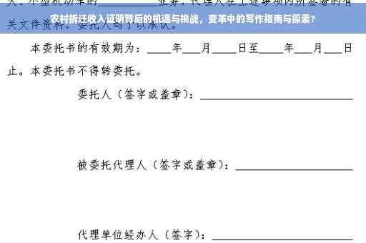 摘要:农村拆迁收入证明是变革中的机遇与挑战的体现。拆迁为农民带来了经济上的机遇,但同时也面临着诸多挑战,如拆迁补偿不公、安置问题、生活成本增加等。写农村拆迁收入证明需注意真实性、完整性和合法性。应详细列出拆迁补偿款、收入来源及持续时间等信息,同时附上相关证明材料,确保证明的有效性和可信度。面对机遇与挑战,农民需积极应对,维护自身权益。