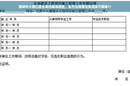 摘要:本文将为您揭秘中国光大银行流水真伪查询的全方位指南与实用技巧。通过本文,您将了解如何有效利用光大银行流水真伪查询系统,掌握查询流水的正确方法,确保流水的真实性和准确性。本文旨在为您提供便捷、高效的查询体验,保障您的财务安全。