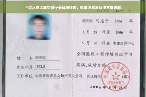 摘要:流水过大导致银行卡冻结,解冻时间因银行处理流程、账户异常性质和提供的证明文件而异。本文详细探讨解冻方法,包括了解冻结原因、提供必要证明文件、联系银行客服等。解决此问题需根据具体情况灵活应对,以确保顺利解冻银行卡。