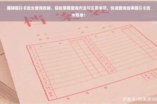 摘要:本文将为你揭秘银行卡流水查询攻略,教你如何轻松掌握查询方法与注意事项。想要查询当事银行卡流水账单,可以通过网上银行、手机银行、银行柜台等途径进行查询。在查询过程中,需要注意保护个人信息和账户安全,确保查询渠道的正规性和合法性。本文将帮助你顺利完成银行卡流水查询,轻松获取所需信息。