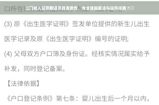 随着全球化的发展,跨国交流和合作日益频繁,江门作为一个经济发达的城市,吸引了众多外籍人士前来工作、生活,在这个过程中,收入证明作为个人经济能力的重要凭证,经常需要进行翻译以满足外籍人士的需求,本文将详细介绍江门收入证明翻译的重要性、翻译内容、注意事项以及常见格式。