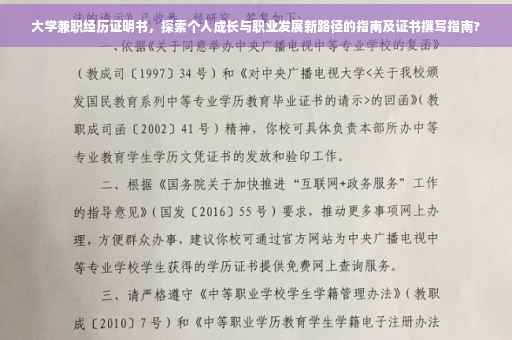 摘要:,,本文介绍了如何撰写大学兼职经历证明书,并探讨了个人成长与职业发展的新路径。文章指出,撰写兼职证明书需要注意清晰明了地表述自己的兼职工作、职责和成果,同时强调这些经历如何促进个人成长和提升职业技能。通过分享大学兼职经历,个人可以探索自己的职业兴趣和发展方向,为未来的职业生涯打下坚实的基础。