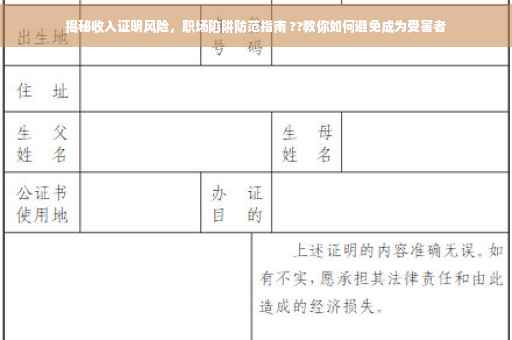 摘要:,,本文将揭示收入证明的风险,并教你如何防范成为职场陷阱的受害者。了解收入证明的重要性及其潜在风险,包括虚假宣传、夸大薪资、合同欺诈等。为防范这些风险,建议职场人士保持警惕,审慎签署合同,核实薪资及福利待遇,避免陷入不实承诺的陷阱。了解自身权益,积极维护合法权益,确保职场之路安全顺利。