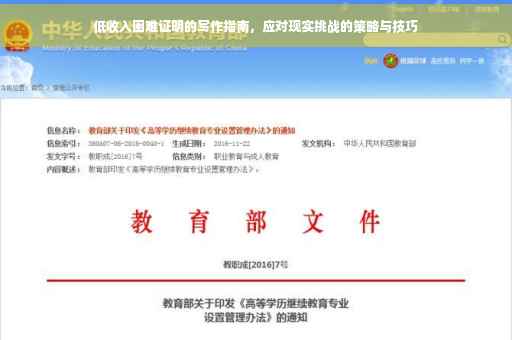 摘要:面对收入低下的困境,撰写收入低困难证明是应对现实挑战的一种方式。证明中应包含个人基本信息、收入状况、家庭负担及其他相关情况,以说明自身所面临的困难。为应对这一挑战,个人可采取提升技能、寻找更高收入的工作机会、合理规划财务等策略。在撰写过程中要实事求是,提供相关证明材料,以增加证明的可信度。