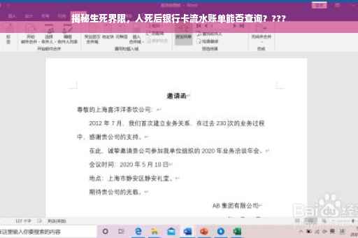 摘要:本文将探讨人死后能否查询银行卡流水账单的问题,揭开生死与金融界限的谜团。文章将简要介绍相关背景和话题的重要性,阐述不同情况下的查询可能性,包括法律和实际操作层面的限制。文章将总结并给出一些建议,帮助读者更好地理解这一敏感话题。摘要字数控制在约150字左右。