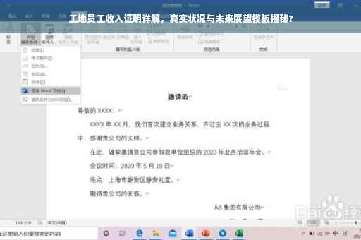 摘要:,,本文是一份关于工地员工收入证明的内容摘要,揭示了真实的收入情况以及未来的展望。文章通过简洁明了的表述,介绍了工地员工收入证明的重要性和作用。提供了收入证明模板,以便更好地了解工地员工的实际收入状况和未来发展趋势。本文强调了未来建筑行业对于工地员工收入的积极影响,并呼吁关注工地员工的权益和福利待遇。