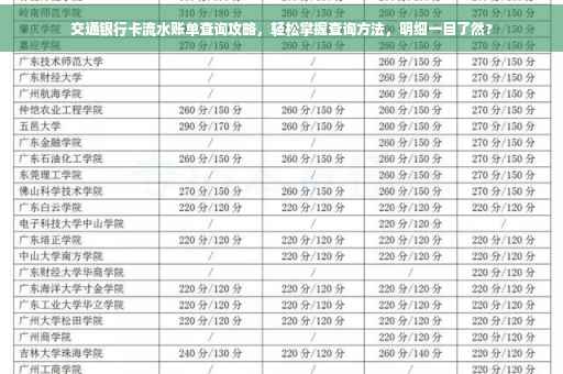 本文提供了交通银行卡流水账单的详细查询方法,帮助持卡人轻松掌握查询技巧,更好地管理个人财务,在查询过程中,请遵循以上途径及注意事项,确保查询的顺利进行,如有任何疑问或需要帮助,请及时联系交通银行客服或前往银行柜台咨询,交通银行卡流水账单查询全攻略,助您轻松掌握个人财务状况!