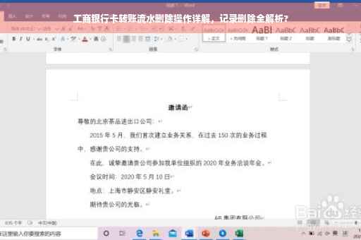 本文详细解析了工商银行卡转账流水的删除操作,包括能否删除、申请删除的条件、步骤及注意事项,希望能够帮助大家了解如何正确处理工商银行卡转账流水删除的问题,在申请删除交易流水时,一定要确保符合相关法律法规及银行规定,避免不必要的麻烦,建议大家定期查看自己的银行账户交易流水,确保账户安全。