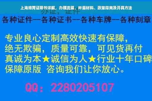 本文全面介绍了上海绝育证明书的办理流程、所需材料以及相关政策,希望广大市民能够充分了解并顺利办理绝育证明书,为自己的家庭生活带来便利,政府部门也应加强宣传,让更多人了解计划生育政策,共同为控制人口数量、提高人口素质贡献力量。