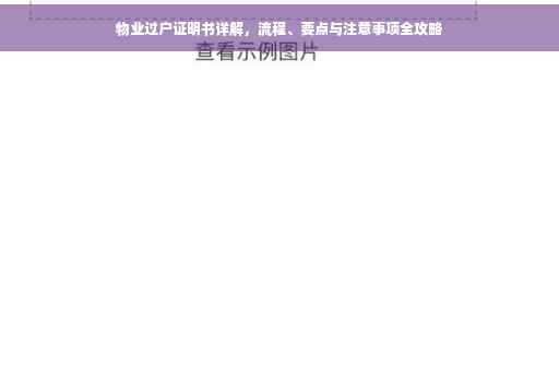 摘要:物业过户证明书是物业产权变更的重要文件。本文详细解释了物业过户证明书的流程、要点及注意事项。流程包括准备相关文件、前往物业管理部门办理手续等。要点包括双方权益保障、物业状况核实等。注意事项提醒,交易时需谨慎,确保文件齐全、真实有效,避免不必要的纠纷。本文旨在帮助读者更好地理解和处理物业过户证明书相关事宜。
