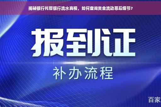 摘要:银行托管银行流水是揭示资金流动真相的重要方式。查询银行托管流水可以通过网上银行、手机银行或前往银行柜台进行。通过查看流水,可以了解资金的收入、支出、转账等情况,确保资金安全。银行托管流水是保障金融透明度和安全的重要手段。