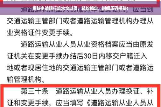 摘要:,,本文揭秘了申请银行流水的全过程,详细指导如何轻松搞定。流程包括准备相关证件、前往银行申请、提交申请并等待审核等步骤。同时解答了关于申请银行流水解压码的疑问。通过本文,读者可以了解银行流水的申请流程,轻松获取所需资料。