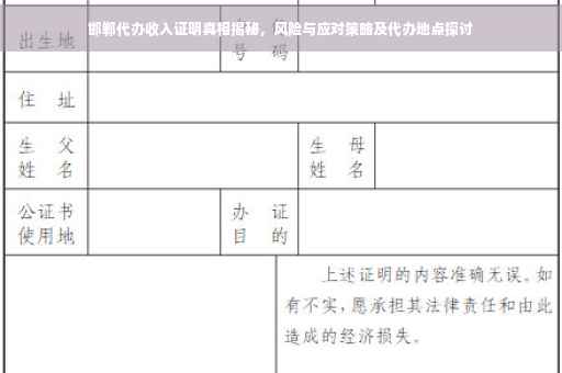 摘要:邯郸存在代办收入证明的现象,但真相和风险需引起关注。代办收入证明可能涉及虚假证明,存在法律风险。应对之策包括谨慎选择代办机构,核实证明真实性,了解相关法律法规,避免陷入风险。关于邯郸代办收入证明的具体地点,可通过当地咨询、网络搜索或相关机构了解。