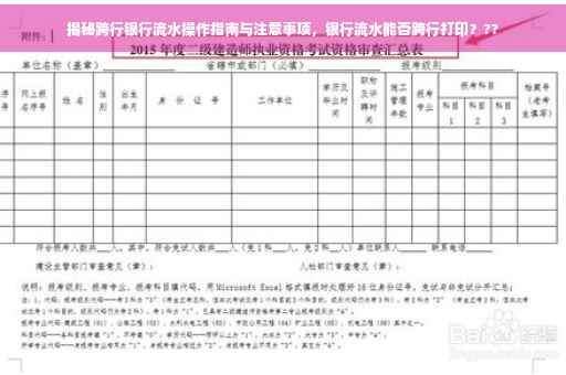 摘要:本文将为你揭秘跨行银行流水的操作指南与注意事项。通过本文,你将了解到银行流水跨行是否可行,以及如何正确操作获取跨行银行流水。本文还将提醒你需要注意哪些问题,以避免在操作过程中遇到不必要的麻烦。让你轻松掌握跨行银行流水的操作技巧,为你的财务规划提供便利。