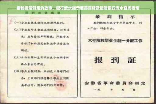 摘要:,,通过银行流水揭示慈善真相,展现捐赠背后的故事。想要查询捐赠银行流水,可通过网上银行或前往银行柜台进行。这些流水记录展示了捐赠款项的流向和来源,让人们更深入地了解慈善事业的真实情况,促进社会的公益发展。
