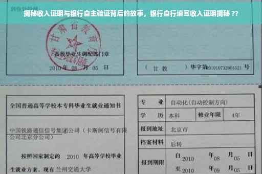 摘要:近期揭秘了收入证明与银行自主验证背后的故事,银行自行填写收入证明引发了广泛关注。这一过程涉及银行对客户经济能力的评估和信用评估,以确保贷款等金融交易的可靠性和安全性。这一做法不仅简化了流程,还提高了验证的效率和准确性。也引发了公众对于个人隐私和信息安全等问题的关注。