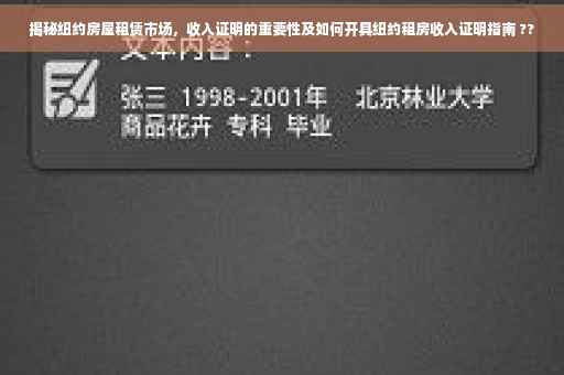 摘要:纽约租房收入证明是房屋租赁市场中的重要环节,体现了收入证明的重要性。在纽约租房时,需要提供收入证明来证明自己的经济实力和支付租金的能力。收入证明可以通过工资单、税单、银行对账单等方式获取,并经过雇主或相关部门盖章确认。了解纽约房屋租赁市场的规则和流程,掌握正确的收入证明开具方法,对于顺利租房至关重要。