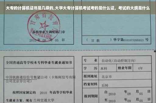 大专计算机考试是计算机一级证书。全国计算机等级考试是社会考试,就考试性质而言,它是一种重视应试人员对计算机和软件的实际运用能力的考试。考试分为四个等级,不同等级的内容不同。一级主要考核微型计算机基础知识和使用办公软件及因特网的基本技能。