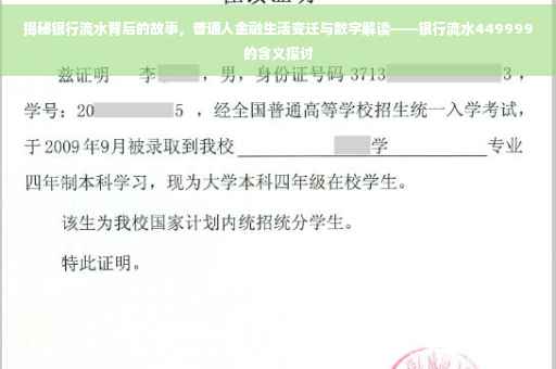 摘要:本文将揭示银行流水背后的故事,通过数字洞察普通人的金融生活变迁。银行流水数字449999所代表的含义也将进行解读。反映了随着时代变迁,人们的金融活动日益频繁,银行流水作为记录这些活动的重要载体,也见证了普通人金融生活的变迁。