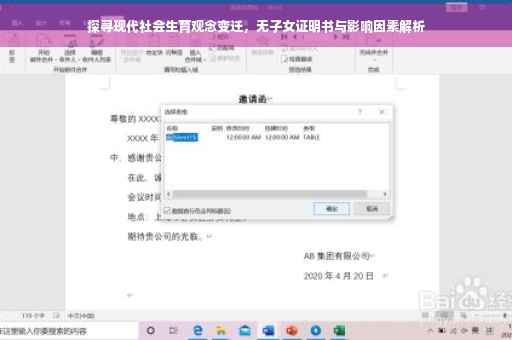 摘要:现代社会生育观念变迁及其影响因素分析。本文将探讨无子女证明书的相关内容,介绍如何撰写无子女证明书。随着时代变迁,人们的生育观念逐渐发生变化,本文将探讨影响生育观念的因素,包括经济、文化、社会心理等方面。通过了解这些变化,人们可以更好地理解现代社会的生育状况,为未来的生育政策制定提供参考。