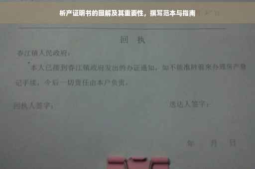 摘要:本文将介绍析产证明书的图片及其重要性。文章提供了关于如何撰写析产证明书的范本,并详细解析了每个部分的要点和注意事项。通过本文,读者可以了解到析产证明书在财产分割和继承过程中的关键作用,以及如何正确撰写一份有效的析产证明,以确保个人权益得到合法保护。