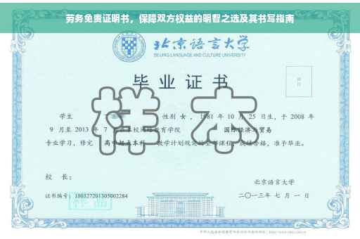 劳务免责证明书摘要:,,为了保障双方权益,劳务免责证明书的撰写至关重要。该证明书旨在明确双方在劳务关系中的责任与义务,并事先约定免责条款,以规避潜在纠纷。内容应涵盖双方基本信息、免责事由及具体条款,明确双方权责范围。撰写时,务必遵循法律要求,确保条款合法、有效。签订劳务免责证明书,有助于建立公平的劳务关系,维护双方合法权益。