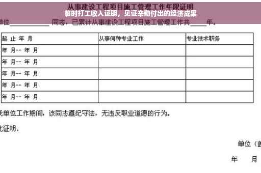 随着时代的发展,越来越多的人选择临时打工来补充家庭收入或实现个人目标,临时打工不仅能帮助人们解决经济上的困境,还能丰富个人经历和提升技能,在参与临时打工的过程中,很多人需要向相关部门或机构证明自己的收入情况,本文将围绕临时打工收入证明展开讨论,帮助大家了解如何合理有效地证明自己的临时打工收入。