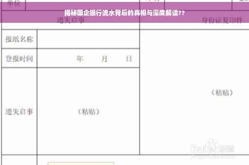摘要:本文揭示了国企银行流水的真相与深度解读。通过详细分析银行流水账单,探讨了国企银行资金运作的背后真相,包括资金流向、规模以及使用效率等方面。文章强调了对于银行流水账单的解读对于了解国企财务状况的重要性,并提醒公众关注国企资金运作的透明度和公正性。