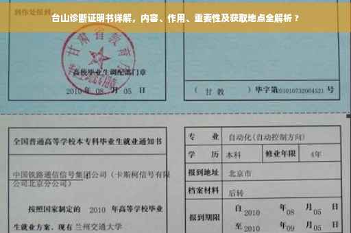 摘要:台山诊断证明书是一份重要的医疗文件,详细记录了患者的病情、诊断结果和治疗建议等信息。该证明书在医疗领域具有关键作用,为患者的治疗和康复提供重要依据。本文将详细介绍台山诊断证明书的内容、作用及其重要性,并说明开具该证明书的地点。通过了解和使用诊断证明书,人们可以更好地保障自身健康权益。