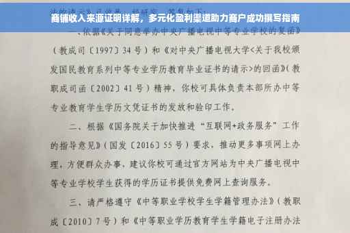 摘要:商铺收入来源证明是展示商铺盈利能力和稳定收入的重要途径。本文将详细解析商铺的多元化盈利渠道,包括销售收入、租金收入、服务费用等,这些渠道共同助力商户成功。撰写收入来源证明时,需清晰列出各项收入来源,提供具体数据支持,如销售额、客流量等,以展现商铺的盈利实力和潜力。本文旨在为商户提供撰写商铺收入来源证明的参考和指导。