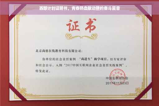 经过一段时间的努力,我荣获了西部计划证明书,这个证明书不仅是对我在西部计划中的表现的认可,更是对我努力的见证,这个证书背后,是我无数个日夜的奋斗,是我无数次的挑战与成长。