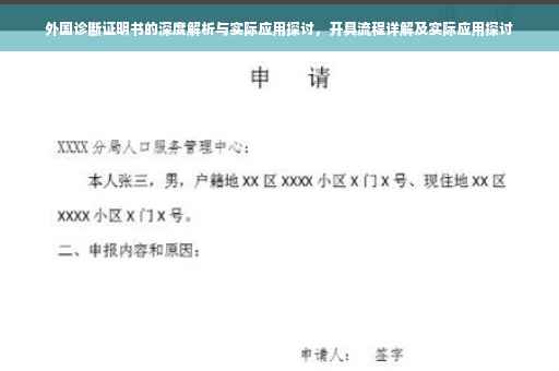 摘要:本文将探讨外国诊断证明书的开具流程和深度解析与实际应用。通过介绍诊断证明书的格式、内容、翻译及认证等关键环节,帮助读者了解如何正确获取和使用外国诊断证明书。本文将着重讨论诊断证明书的实际应用场景,为读者在实际操作中提供指导。