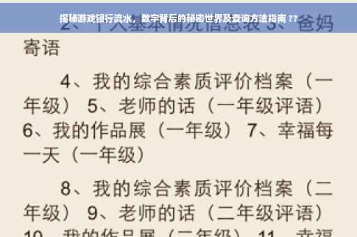 摘要:本文将介绍如何查看游戏银行流水,揭示数字背后的秘密世界。通过简单的步骤,您将能够了解游戏账户的资金流动情况,包括充值、提现和消费等记录。掌握这些方法,有助于您更好地管理游戏财务,发现潜在的风险和问题。保护个人隐私和账户安全至关重要,在查看银行流水时,请确保操作合规合法。